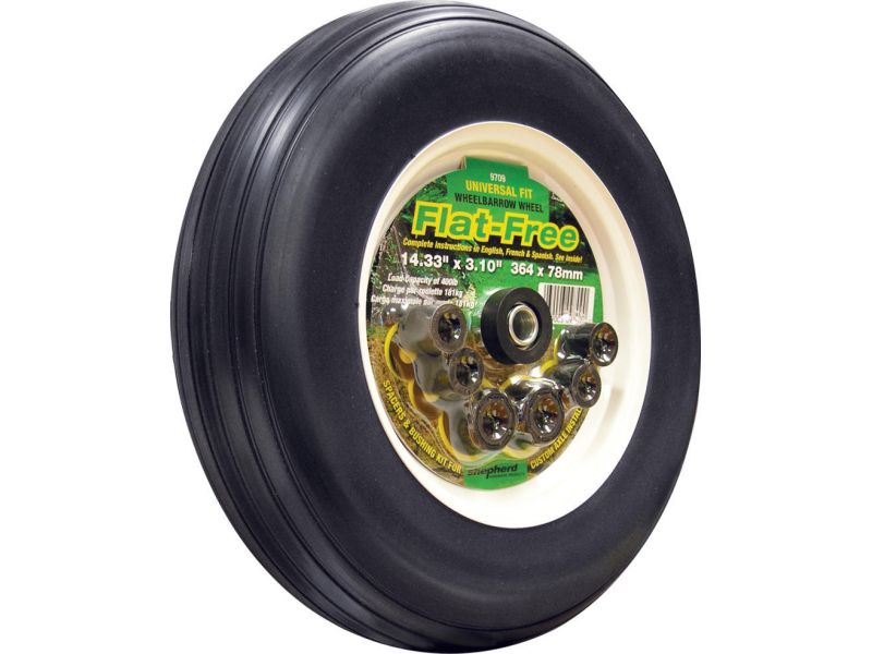 The Shepherd Hardware flat free replacement tires provide a cushioned ride that can also withstand punctures from common objects that cause flats. This helps eliminate all downtime related to flat tires. These tires are extremely durable and can last up to 10 times longer than standard air filled tires. The shepherd 9709 model features a 14″ diameter wheel with a 3″ ribbed tread face and a 400-lb load capacity. Also features universal fit, includes spacers and bushing kit for custom axle installations.
