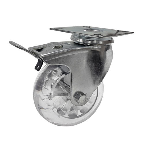 High quality versatile castor with a transparent Polyurethane wheel, 100mm diameter and 125kg load capacity. High quality Polyurethane lasts 5x longer than Rubber.