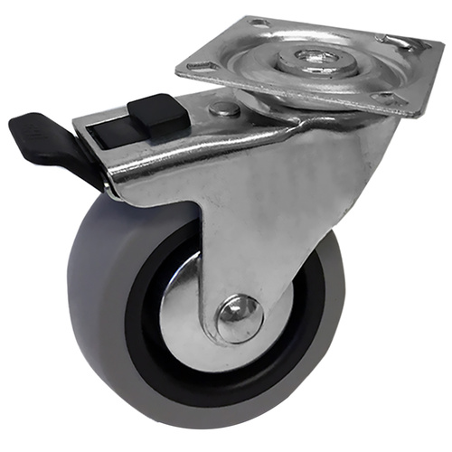 High quality versatile castor with grey rubber wheel, 75mm diameter and 55kg load capacity. Soft grey rubber is non-marking and quiet.