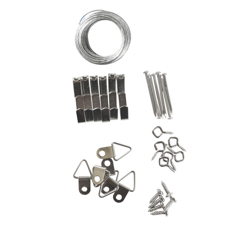 Everhang picture hanging kits makes it easy to hanging pictures. The kit contains screw eyes, picture wire and angle drive hooks.