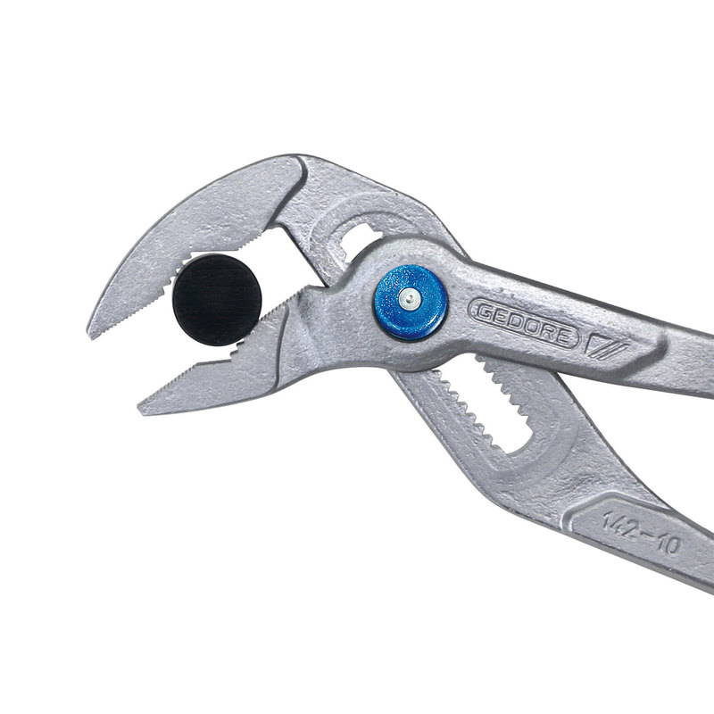 - Fine adjustment with push-button. Long slim jaws. Offset gripping faces for self-gripping of nuts and pipes