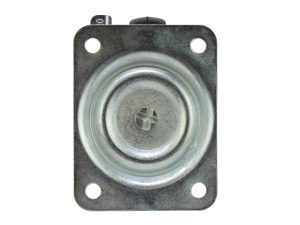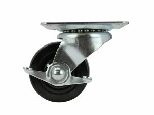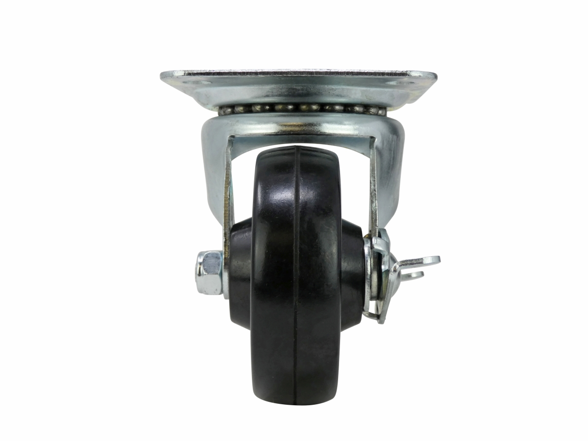- 4 inch diameter black soft rubber wheel with ball bearing swivel, side brake and plate mount