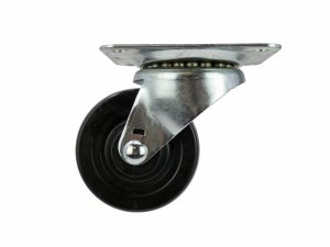- 4 inch diameter black soft rubber wheel with ball bearing swivel and plate mount