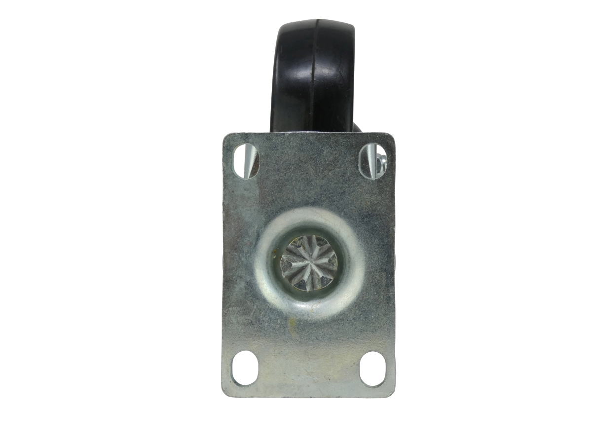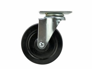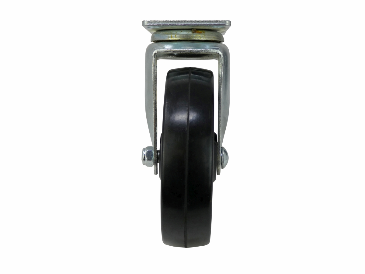 - 5 inch diameter black soft rubber wheel with ball bearing swivel and plate mount
