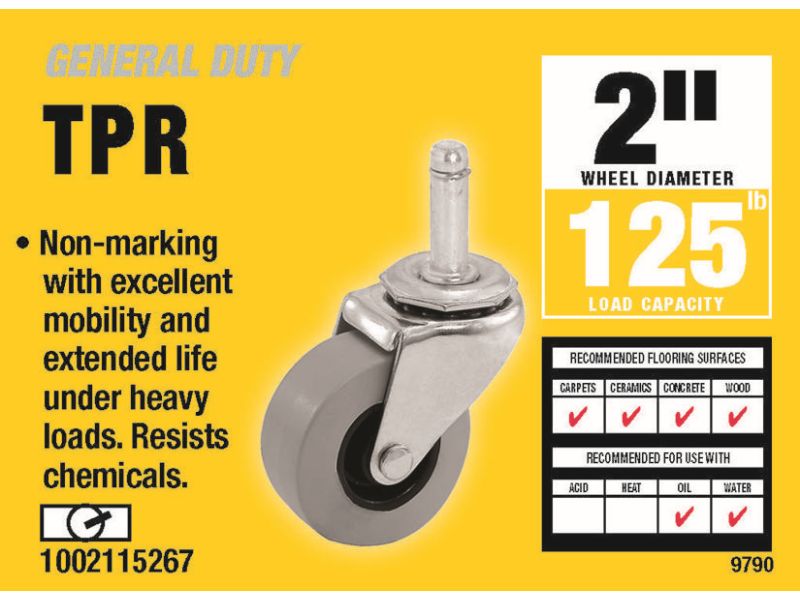 The Shepherd Hardware 2 inch TPR grip stem casters are great for use on store fixtures, carts and institutional equipment and offer resistance to oils and chemicals. The non-marking wheel surface combines with superior endurance and quiet mobility. They feature a double ball bearing raceways for instant swiveling.