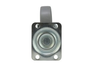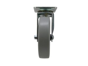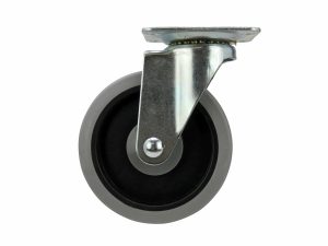 - 5 inch diameter gray thermoplastic rubber wheel over black polypropylene hub with ball bearing swivel and plate mount