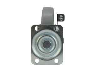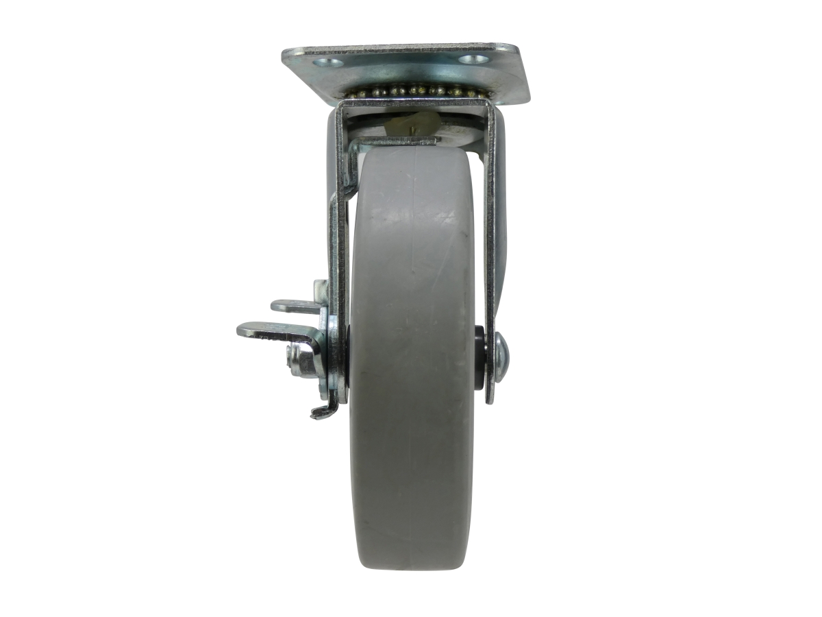 - 5 inch diameter gray thermoplastic rubber wheel over black polypropylene hub with ball bearing swivel, plate mount and side brake