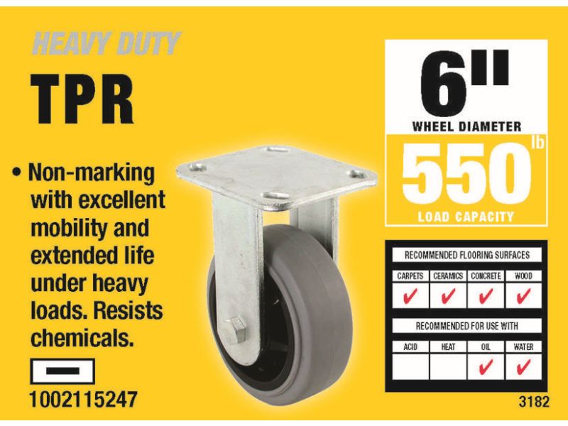 The Shepherd Hardware 6 inch rigid thermoplastic caster is an extra heavy-duty wide caster that is non-marking with excellent mobilitythat possesses extended life under heavy loads. Gray TPR resists chemicals and is recommended for all types of surfaces.