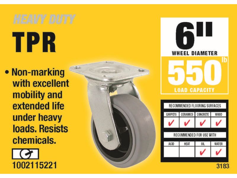The Shepherd Hardware 6 inch swivel thermoplastic caster is an extra heavy-duty wide caster that is non-marking with excellent mobilitythat possesses extended life under heavy loads. Gray TPR resists chemicals and is recommended for all types of surfaces.