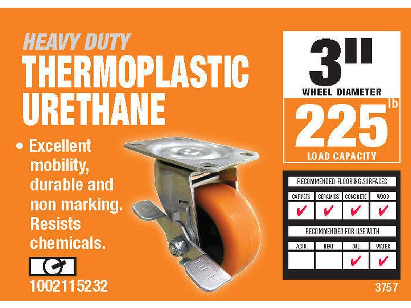 - 3 inch diameter bright orange thermoplastic urethane wheel over black polypropylene hub with ball bearing swivel, plate mount and top brake