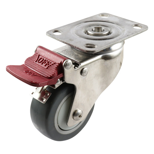 High quality Stainless Steel castor with 75mm grey rubber wheel and 80Kg capacity. Soft grey rubber is non-marking and quiet.