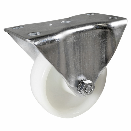 High quality industrial strength 75mm nylon castor with 120Kg capacity. White Nylon is durable and ideal for warehouse and workshop environments, it also has a moderate chemical resistance.