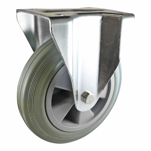 High quality light industrial zinc plated 200mm Grey non-marking rubber castor with 200kg load capacity. Soft grey rubber is non-marking and quiet.