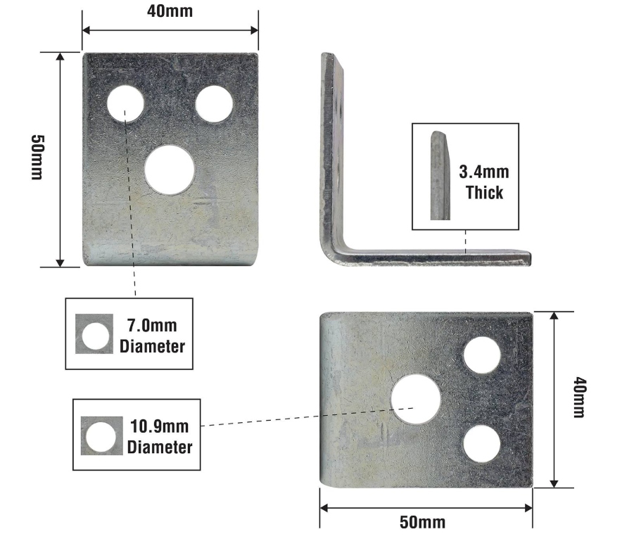 a heavy duty angle bracket measuring 50X50X40MM, designed to support loads up to 150 kg. Made from steel and finished with a zinc plated coating, this bracket is ideal for structural reinforcements, shelving, and various DIY repair projects. Its precise design and durable construction appeal to the DIY-savvy buyer, offering a practical solution for tasks that demand a reliable and strong metal support component.Detailed
