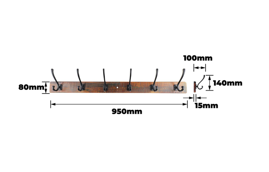 HOOK HAT & COAT RACK 95CM RUSTIC 6 BLK HOOKS is a practical and stylish storage solution designed for DIY enthusiasts. The robust board, crafted from pine with aluminium accents, is finished in an antique wood colour and features six sturdy black hooks. Perfect for hanging coats, hats and other accessories, its easy-to-install design brings both functionality and rustic charm to retail, home and workshop settings.Detailed