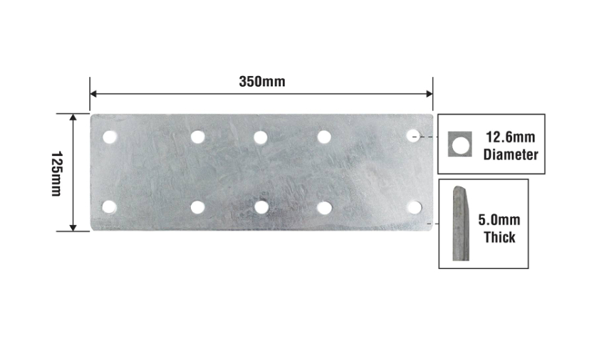 The Mending Plate is a robust solution for reinforcing and joining wood structures, ideal for DIY enthusiasts looking for reliable support in their projects. Measuring 350x125x5mm, this hot-dipped galvanised steel plate offers excellent durability and corrosion resistance, ensuring long-lasting performance in various applications. Whether you're repairing furniture or constructing shelving, this mending plate is a valuable addition to your toolkit.Detailed