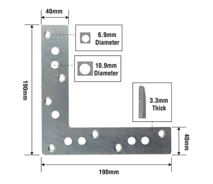 The Mending Plate is a durable and versatile steel connector designed for reinforcing joints in DIY projects. Measuring 190mm by 190mm and 3.5mm thick, this zinc-plated plate is ideal for a variety of structural applications, providing excellent strength and stability. Its practical design simplifies assembly, making it a necessary addition for anyone looking to strengthen wooden frameworks or furniture.Detailed