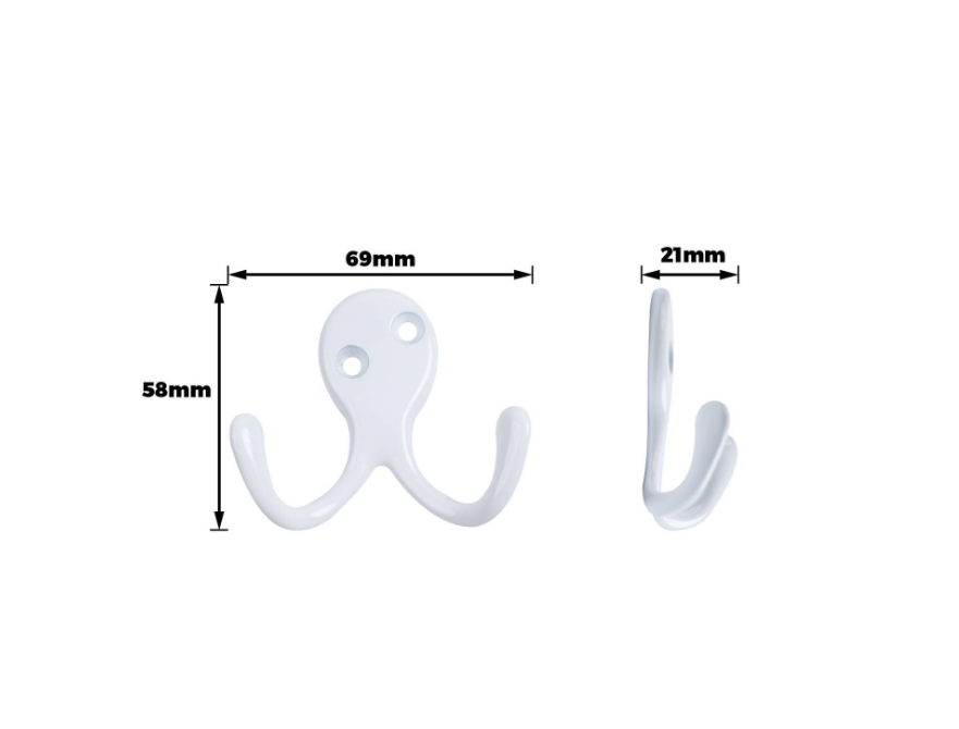 Double Robe Hook White PK2 is a set of decorative hooks designed for practical hanging solutions in both domestic and professional environments. Constructed from white aluminium, these hooks combine durability with a sleek aesthetic suitable for bathrooms, laundries, or utility areas. Offering four hooks per pack, they provide a secure and reliable mounting system for hanging robes and other garments, making them an ideal choice for DIY enthusiasts who value straightforward installation and quality specifications.Detailed