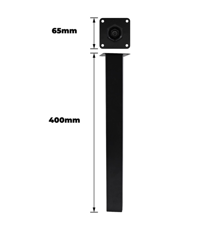 The 40 x 40mm x 400mm square black leg is designed for DIY enthusiasts looking to enhance furniture stability and aesthetics. Made from robust steel and complemented with plastic components, this leg is an ideal choice for various home projects. Its sleek black finish adds a modern touch while ensuring durability, making it suitable for chairs, tables, or cabinets.Detailed