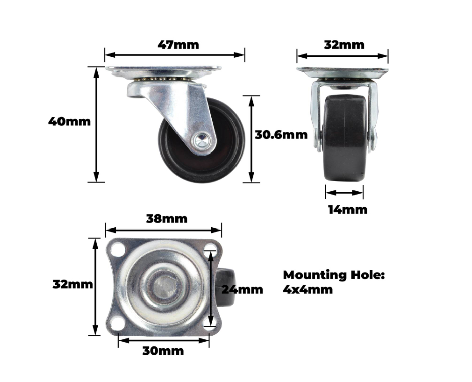 Castor Black Polypropylene Swiv/Plate 30mm PK4 is a robust and versatile caster designed for small-scale DIY projects requiring reliable mobility. The caster incorporates a plain bearing with a single raceway ensuring smooth movement and stability. Constructed with polypropylene for both the wheel core and tyre, alongside a durable steel housing and bearings, it is engineered for resistance to wear and corrosion. Ideal for light-duty applications, each pack provides 4 units in secure polybag packaging.Detailed