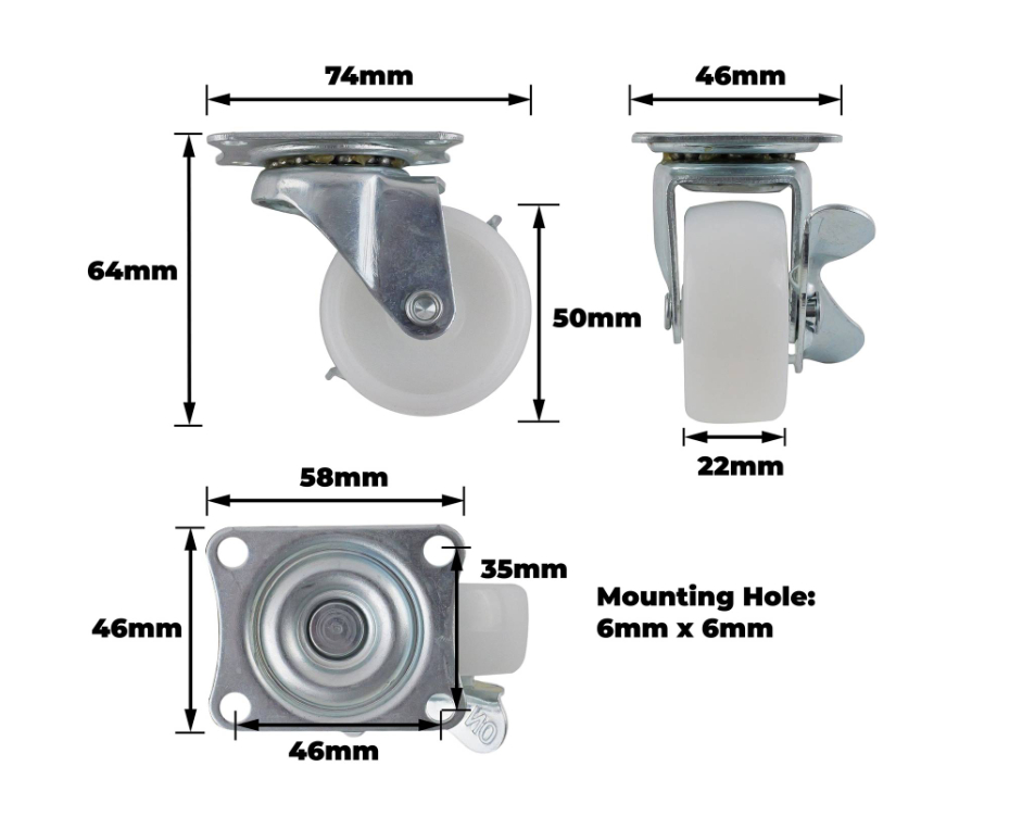 Castor White Polypropylene Swiv/Plate Brake 50mm is a durable, technical caster designed for DIY enthusiasts. With a solid steel housing and precision-engineered components, this plate caster offers reliable manoeuvrability and a secure brake system to keep your projects stable. The plain bearing and single raceway design ensure smooth rotation and low friction even under a load of up to 30 kgs, making it a practical choice for both retail and online technical applications.Detailed