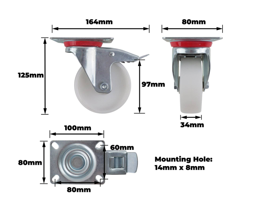 Castor White Polypropylene Swiv/Plate Brake 100mm