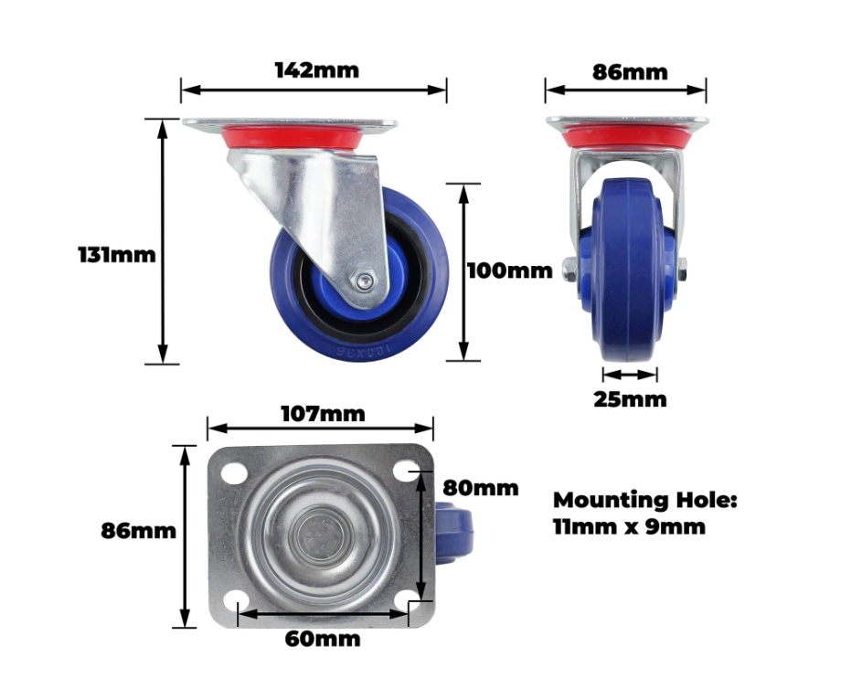 Castor Blue Elast Rub. Swiv/Plate 100mm is a robust castor designed for use in industrial equipment, storage units and various DIY projects. It features a roller bearing in a single raceway configuration that promises smooth swivel motion. The steel housing and bearings combined with a polypropylene wheel core and rubber tyre ensure durability while supporting loads up to 150 kg. This castor's practical design offers reliable movement and secure plate fixing for efficient installations.Detailed