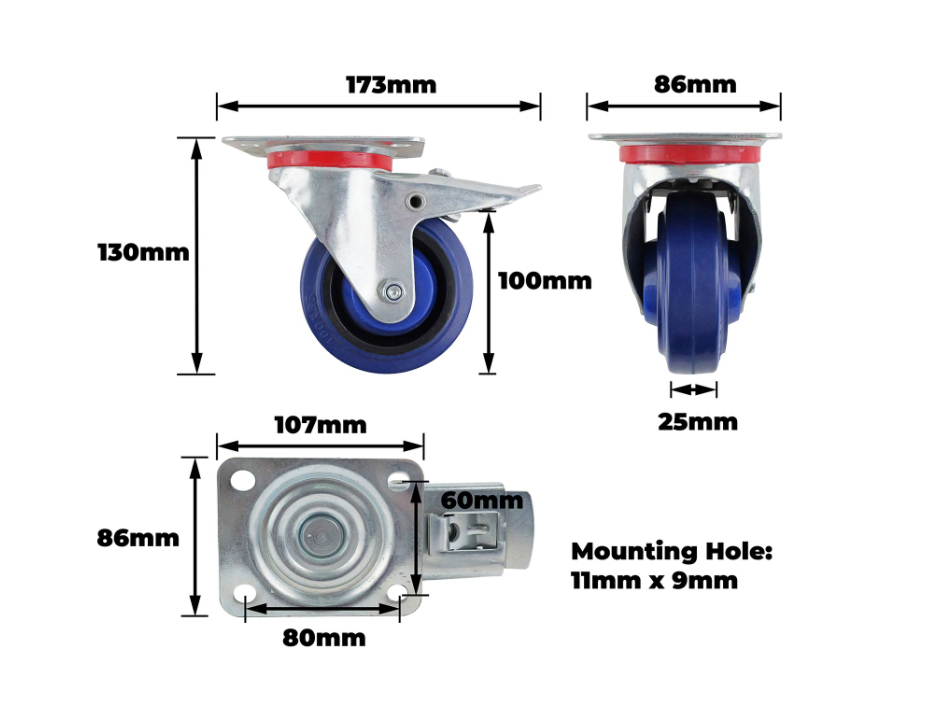 Castor Blue Elast Rub. Swiv/Plate Brake 100mm is engineered for durability and precision in a range of DIY applications. Featuring robust steel housing, a polypropylene wheel core and rubber tyre, this caster ensures smooth manoeuvring under loads up to 150 kgs. The integrated roller bearing and single raceway design offer reliable performance on both retail and online projects. Ideal for DIY enthusiasts who prioritise technical specifications and practical, long-lasting mobility.Detailed