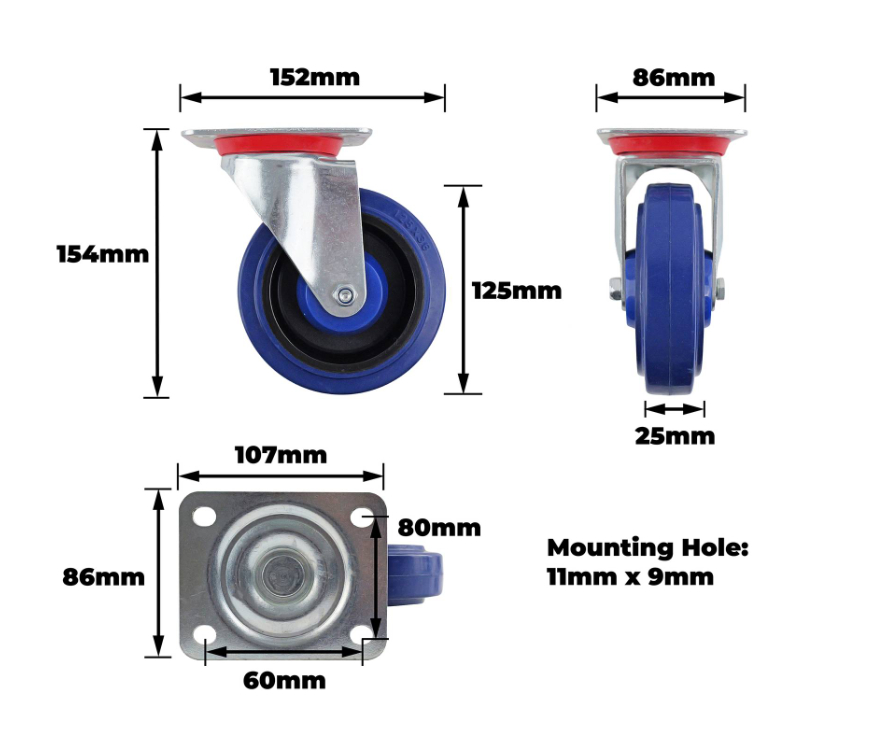 Castor Blue Elast Rub. Swiv/Plate 125mm is a robust castor plate designed for workshop and light industrial applications. The unit features roller bearings and a single raceway, delivering smooth and reliable movement under a load capacity of 150 kilograms. Constructed with a steel housing, polypropylene wheel core, and rubber tyre, it ensures durability and precision for DIY enthusiasts seeking dependable manoeuvrability in their projects.Detailed