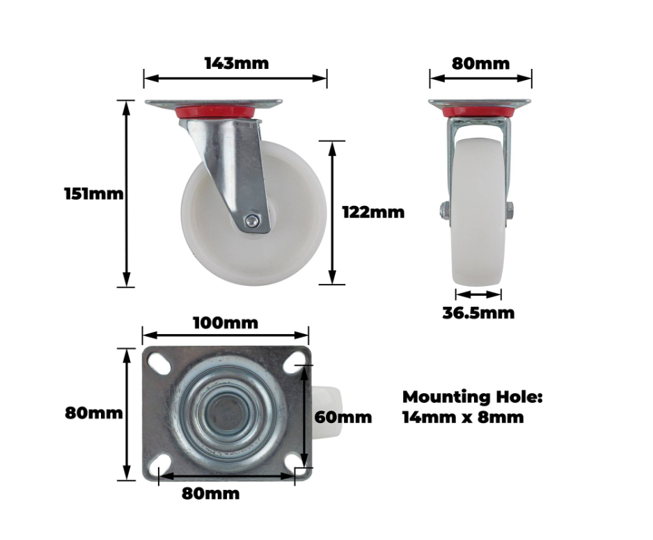 Castor White Polypropylene Swiv/Plate is a functional castor plate designed for easy mobility and load-bearing applications. Constructed with robust polypropylene and a steel housing, it features a single raceway roller bearing for smooth rotation and reliable stability under heavy use. With a maximum load capacity of 100 kg, this castor is ideally suited for DIY projects, furniture movement and other practical applications.Detailed