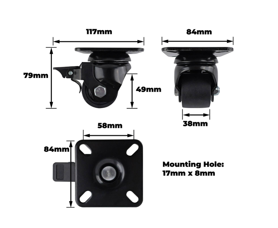 Machine Castor Black Swivel Brake 50mm 300kg is a robust plate castor designed for DIY and commercial applications. Constructed with a steel housing and nylon wheel core, it is fitted with a double ball bearing system and single raceway for smooth, precise manoeuvrability. Its integrated swivel brake provides enhanced control, supporting loads up to 300kg. This castor combines durable materials with precise engineering to meet the demanding technical specifications of modern projects.Detailed