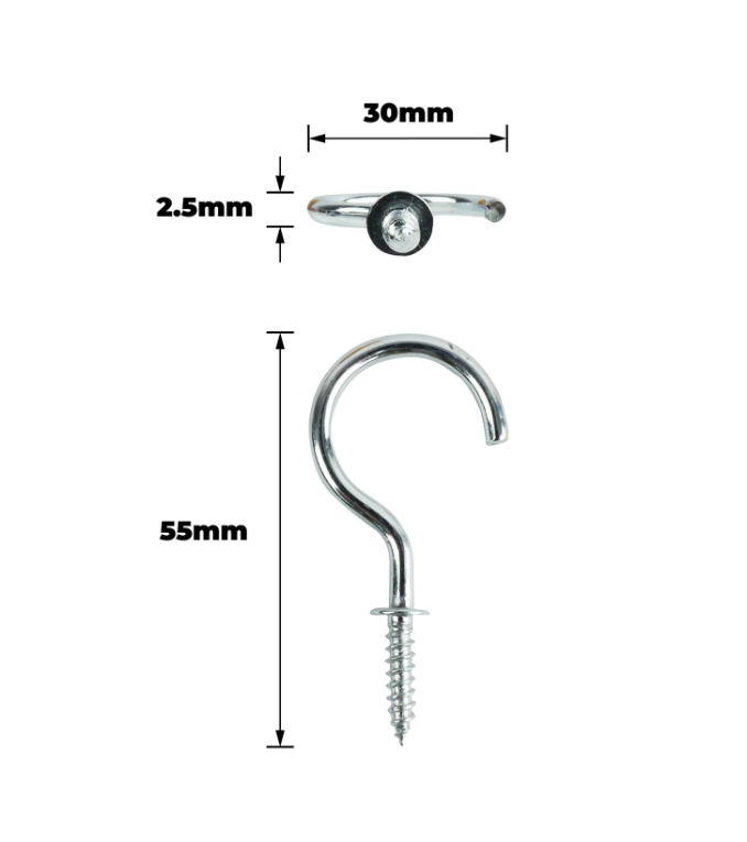 This product is a set of robust cup hooks designed for precise and reliable hanging solutions in DIY projects. They provide an efficient method for organising tools and materials in workspaces, garages and workshops. Each piece is engineered to offer secure support with a 38mm shouldered design and is conveniently packaged in a polypropylene polybag. Ideal for DIY enthusiasts who value technical integrity and practical application.Detailed