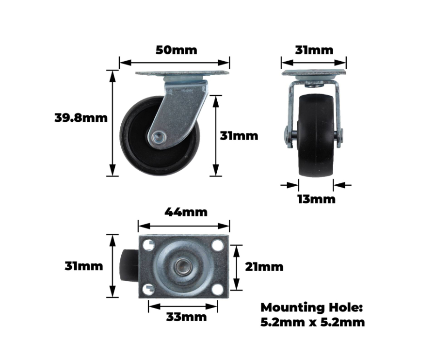 Castor Swivel Plate 40mm Black PK2 is a robust castor plate designed for precise manoeuvring in DIY projects and light industrial applications. Featuring a plain bearing for smooth rotation and a dual raceway for improved load distribution, this plate optimises equipment movement. The polypropylene wheel and tyre combine with a durable steel housing, ensuring reliable performance under loads up to 23 kgs. Packaged in pairs, it offers an efficient solution for retail and online buyers seeking technical excellence.Detailed