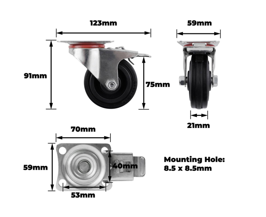 Castor S/E Black Rubber Swiv/Plate Brake is engineered for DIY enthusiasts seeking precise, dependable load management. This plate-type castor features a plain bearing for smooth rotation and braking control, ensuring enhanced manoeuvrability in workshop or industrial settings. Its robust design and durable rubber tyre make it ideal for projects requiring reliable, technical performance and controlled movement. With a compact design and easy integration, it serves as a practical solution for various DIY applications.Detailed