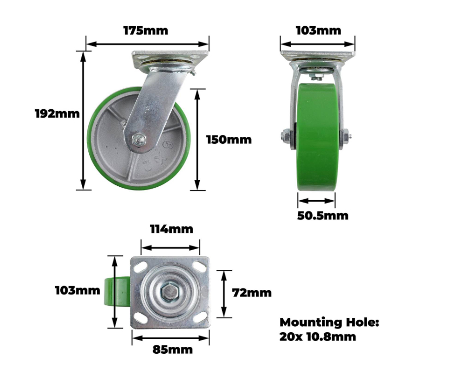 Castor Green PU/Cast Iron Swiv/Plate 150mm is a robust caster designed for DIY-savvy enthusiasts who demand reliable performance. Its combination of a green polyurethane finish with durable cast iron and steel components provides long-lasting stability. The roller bearing equipped with a single raceway ensures smooth rotation, making it suitable for workshop and industrial projects. This component’s precise engineering is highly valued for its practical applications in various load-bearing tasks.Detailed