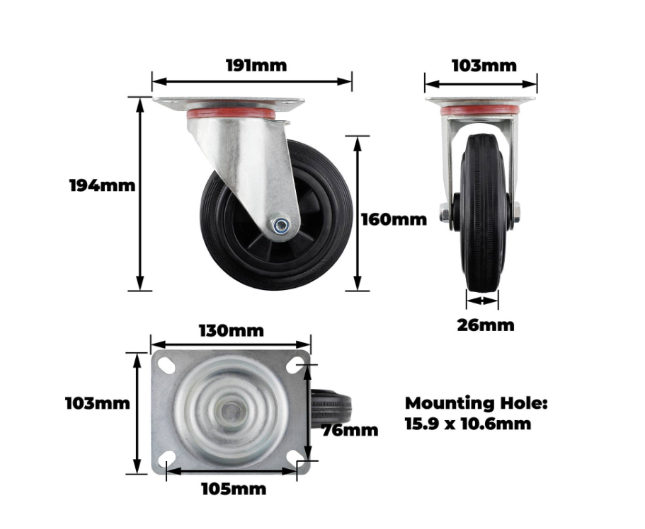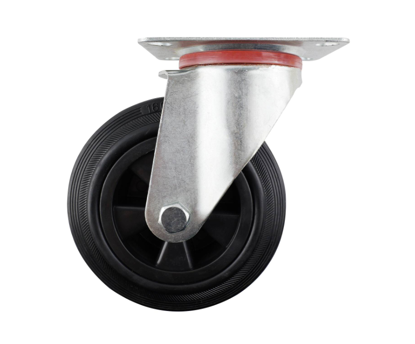 CASTOR SWVL PLATE D160 135KG - BLACK RUBBER is a robust castor plate designed for DIY and light commercial applications. It is engineered to support loads up to 135kg and features a plain bearing with a single raceway for smooth, consistent movement. The high-quality black rubber wheel ensures durable performance and ease of mobility, making it an ideal choice for workshops and retail spaces where reliability and precise technical specifications are valued.Detailed