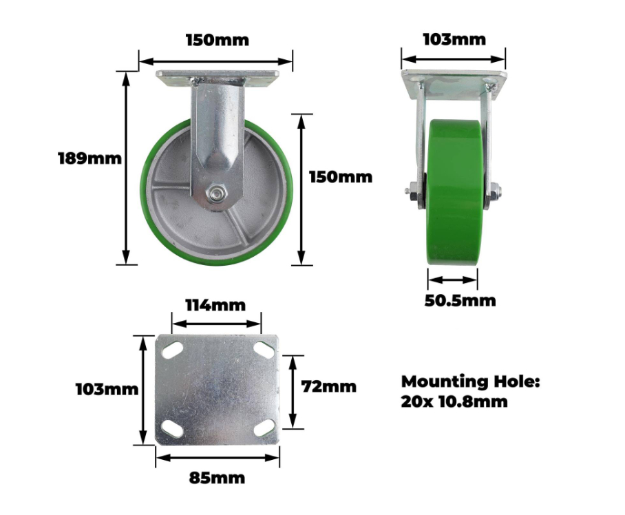 Castor Green PU/Cast Iron Fixed Plate 150mm is a robust, fixed castor designed for heavy-duty DIY and industrial applications. It combines a durable green PU top with a cast iron fixed plate to support consistent performance under challenging loads. The unit features a roller bearing mechanism with a single raceway design and a steel wheel core, delivering reliable movement and excellent stability. Its technical construction is ideal for those seeking dependable, long-lasting equipment for practical tasks.Detailed