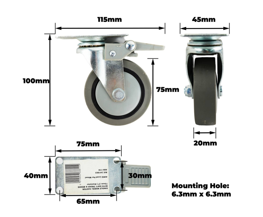 Castor Grey Rubber Swiv/Plate Brake 75mm is a robust castor component designed for plate applications in DIY projects. Engineered with simplicity and durability in mind, this device offers a plain bearing system and single raceway design to enhance stability under load. Constructed using high-quality steel housing and TPR wheel material, it is ideal for projects requiring reliable braking and smooth manoeuvring. Suitable for both retail and online DIY enthusiasts demanding practical and technical efficiency.Detailed