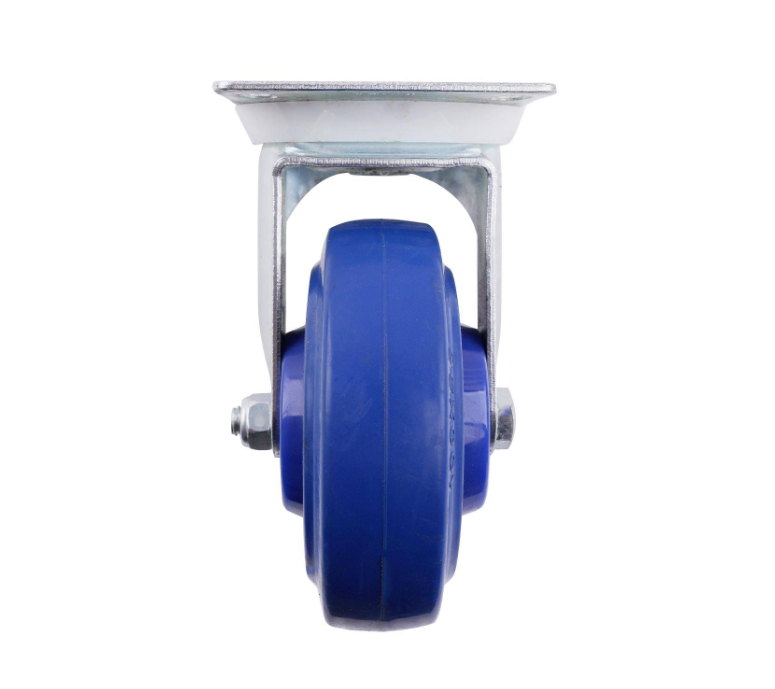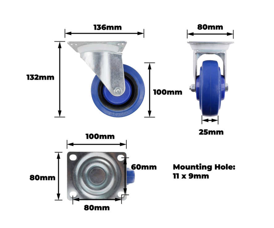 Castor Blue Elast Rub. Swiv/Plate 100mm is a robust castor plate designed for practical DIY applications. Ideal for enhancing mobility in workspaces or equipment, this plate features a rubber wheel coupled with a roller bearing system for smooth movement. Its single raceway design ensures even load distribution and ease of installation while offering durability in demanding tasks.Detailed