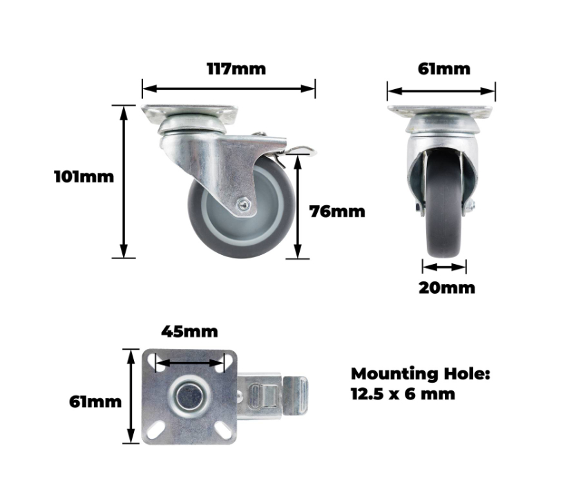 CASTOR SWVL PLATE WITH BRAKE D75 60KG - TPR is a robust castor plate engineered for precise mobility control in DIY and professional settings. Designed with a plain bearing system, it provides smooth motion and reliable braking, ensuring stability during heavy-duty use. The TPR wheel construction offers excellent durability, making it ideal for applications requiring consistent performance and longevity when repositioning equipment.Detailed
