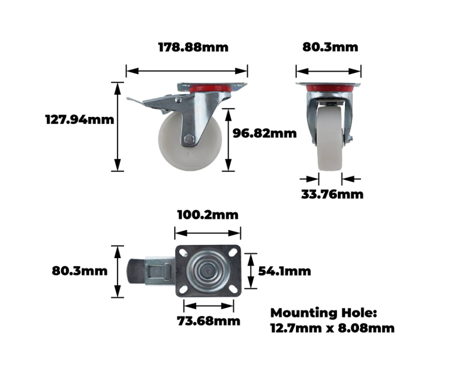 We present the White Nylon Swivel Castor Braked, a high-performance caster designed for precise manoeuvring and stability in DIY projects. Engineered for secure and smooth rotation, this caster features a robust steel housing and plain bearing system optimised for single raceway applications. Ideal for both retail and online DIY enthusiasts, it offers dependable load capacity and durability, making it an excellent choice for practical applications such as furniture reconfigurations and industrial equipment modifications.Detailed