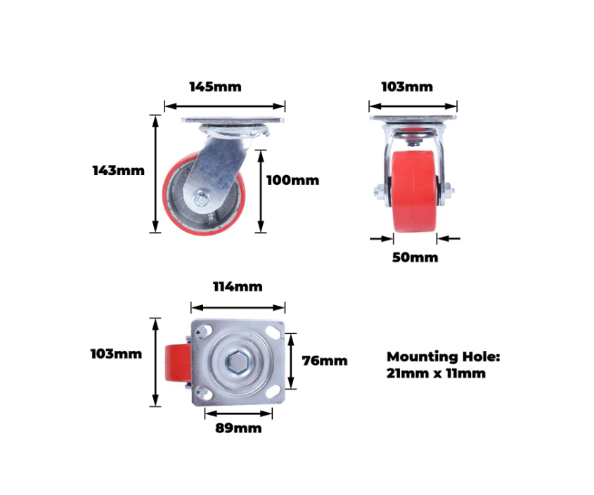 - Red Industrial Swivel 100mm, 320kg is a robust caster designed for demanding DIY and industrial applications. This swivel caster delivers reliable performance in retrofitting mobile workstations, heavy equipment and commercial installations. Engineered with a roller bearing system, it provides smooth rotation and excellent load distribution. Its single raceway design enhances structural integrity and longevity, making it a practical choice for those valuing precise technical specifications and durable construction.Detailed