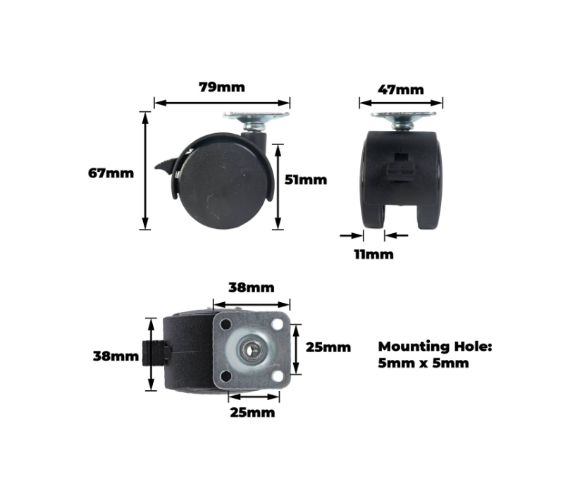 Black Polypropylene swivel castors with brake: These twin 50mm wheels, paired with a 38x38mm top plate, deliver reliable manoeuvrability and control for DIY applications. Engineered with a plain bearing and dual raceway design, these castors ensure smooth rotation and effective braking for secure positioning during technical tasks. Ideal for retail or online buyers looking for practical, precision-engineered components for small equipment and workbench mobility.Detailed