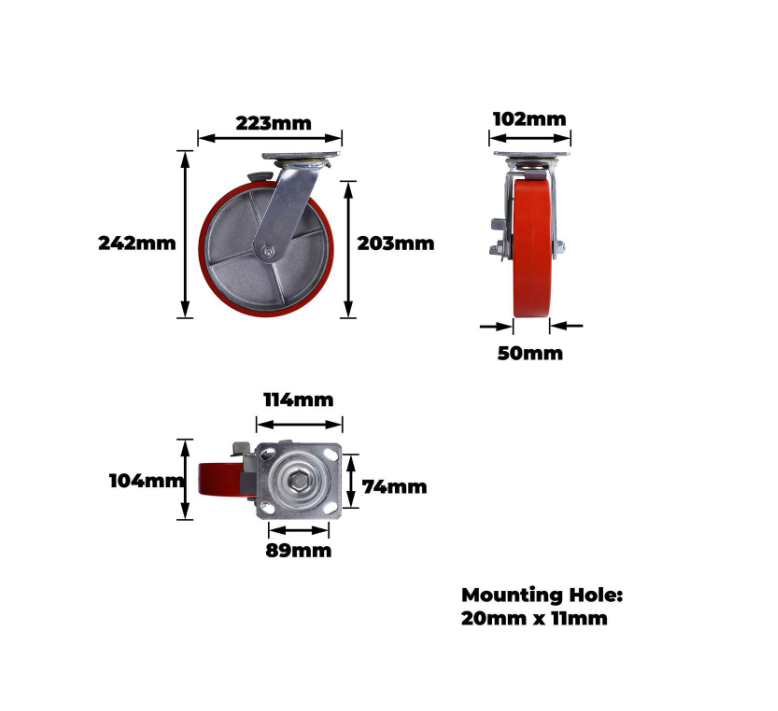 RED POLY'THANE SWIV BRAKE CASTOR STEEL HUB 200MM is engineered for reliable support in demanding manual projects and industrial applications. This swivel castor is designed for DIY enthusiasts requiring practical mobility and secure braking. Featuring a robust steel hub and a red poly'thane wheel, it offers dependable performance under heavy loads (up to 454 kg). The precision-engineered roller bearings and single raceway ensure smooth and accurate manoeuvrability for various transport and positioning tasks.Detailed