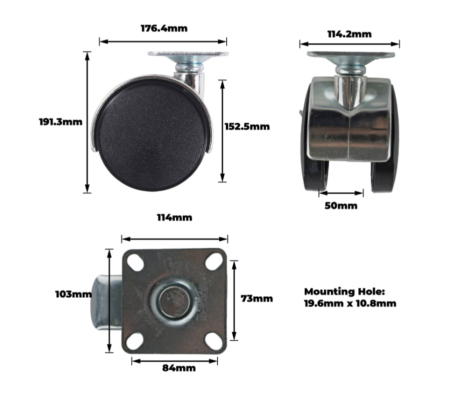 Black Polypropylene swivel twin wheels feature a robust zinc alloy frame with a chrome plated finish and a 50mm wheel diameter. The top plate, measuring 38x38mm, supports loads up to 40kg. Designed for DIY projects and refurbishments, these wheels offer reliable manoeuvrability and durability on various surfaces. Their technical design ensures seamless performance in customised applications for retail and online buyers who value practical specifications.Detailed
