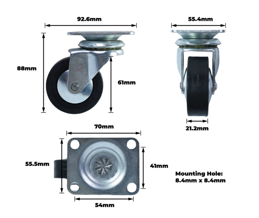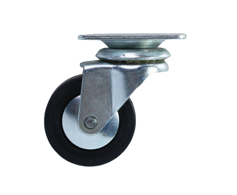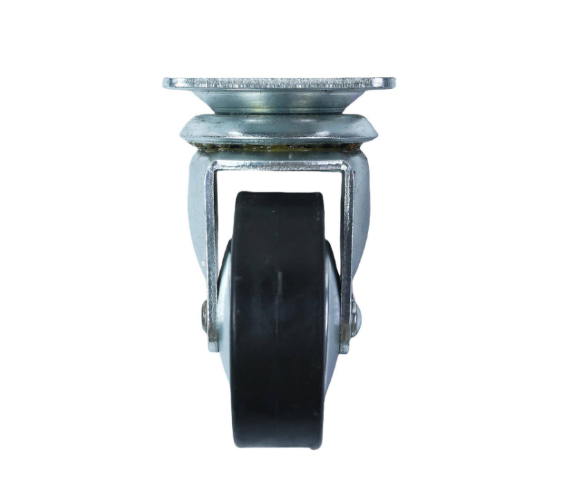 Black rubber swivel wheel 65mm with a zinc plated top measuring 75 x 60mm, and a load capacity of 40kg. This robust wheel is designed for DIY enthusiasts seeking a balance of durability and precision. It is ideally suited for applications in trolleys, custom equipment, and light industrial projects. With its practical design and technical specifications, it offers reliable performance and resistance to wear in demanding environments.Detailed