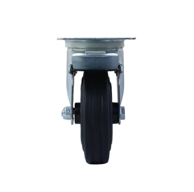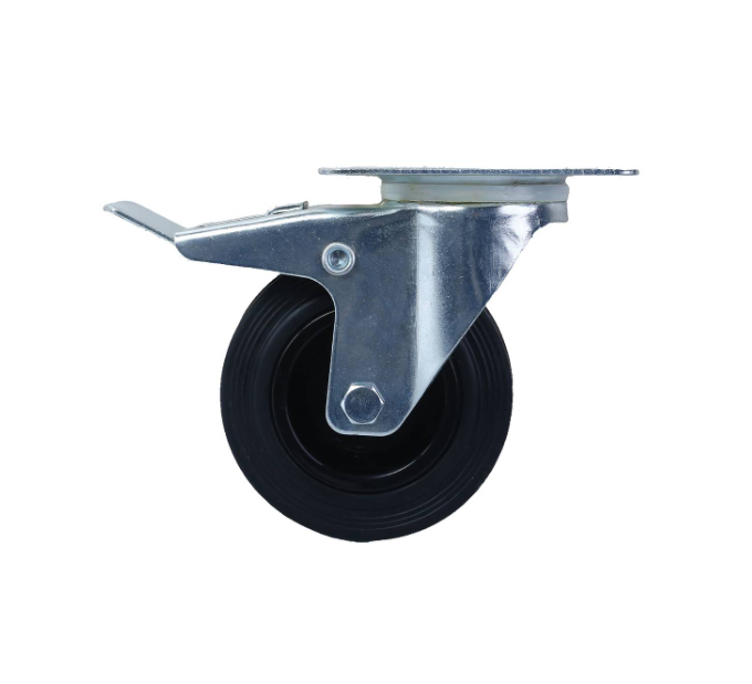 Black rubber swivel wheel 100mm, roller bearing, zinc plated top 105X85mm, with brake, 75kg