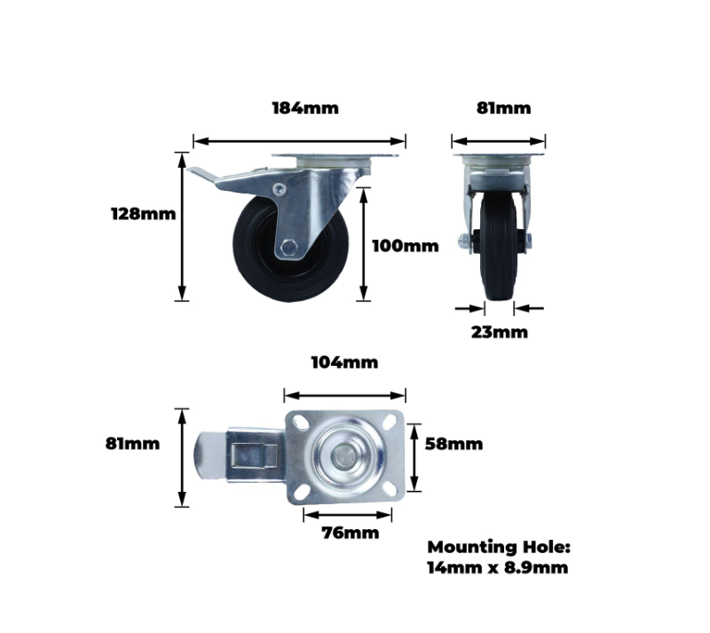 Black rubber swivel wheel 100mm with a zinc plated top measures 105x85mm and incorporates a roller bearing system for smooth operation. Designed for DIY enthusiasts, this castor with brake supports loads up to 75kg, offering dependable mobility and stability during technical applications. Its plain bearing and single raceway configuration ensure low friction, making it an efficient choice for both retail and online buyers looking for practical, high-performance components.Detailed