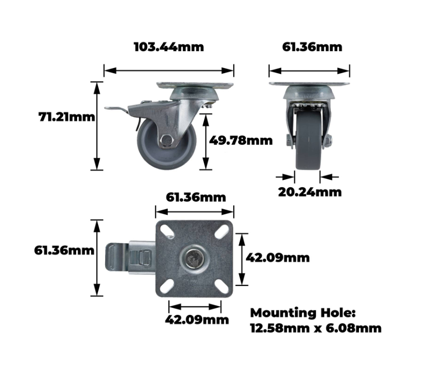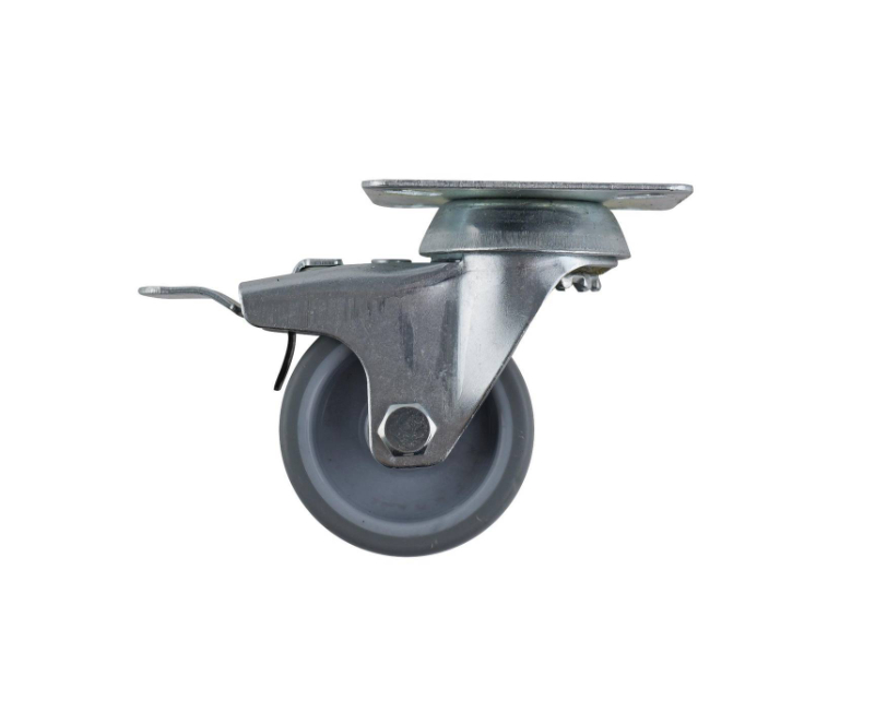 Grey PU swivel wheel with plain bearing and zinc plated fork offers a reliable solution for mobility in DIY projects and small equipment. Designed with a 50mm PU wheel and built-in brake, this castor ensures controlled movement for trolleys, workbenches and various repair applications. The plain bearing construction minimises maintenance, while the robust steel housing and TPR wheel provide durability. Ideal for DIY enthusiasts seeking practical, technically sound components for custom modifications.Detailed