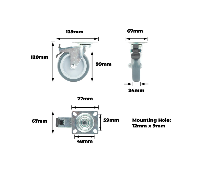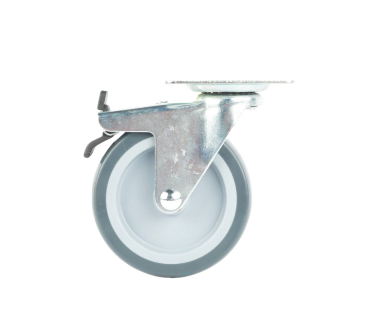 Grey PU swivel wheel 100mm, Zinc plated top 77X67mm, with brake, 70kg – this precision-engineered castor is designed for DIY enthusiasts and practical users. It delivers reliable manoeuvrability and braking performance, making it ideal for light industrial and workshop applications. Constructed with a plain bearing and a single raceway design, it ensures smooth operation and durability under a load capacity of 70kg. This castor provides a robust and cost-effective solution for custom mobility projects.Detailed